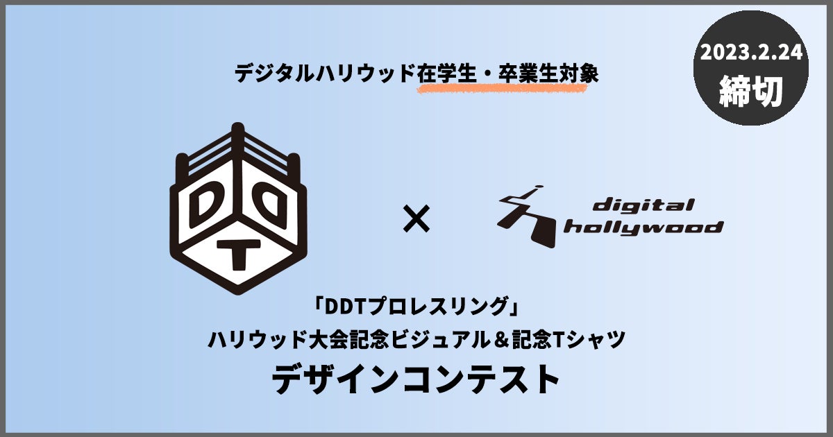 IT関連及びデジタルコンテンツの人材養成スクール・大学・大学院を運営するデジタルハリウッド株式会社(本社:東京都千代田区、代表取締役社長兼CEO吉村毅、学長 杉山知之)は、DDTプロレスリング、プロレスリング・ノア、東京女子プロレス、ガンバレ☆プロレスの運営などを行う株式会社CyberFight(本社:東京都新宿区、代表取締役社長 高木規)と共同で、DDTプロレスリングのハリウッド進出を記念して当社が展開をする学校に所属する全ての在学生および卒業生を対象としたデザインコンテストを開催いたします。