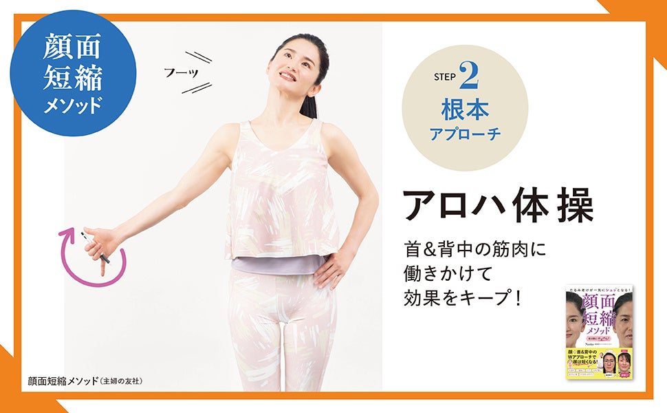 たるみ老けを一気に解決するのが、Naoko式「顔面短縮メソッド」です。「顔面短縮メソッド」の大きなポイントは、即効アプローチの「顔」+根本アプローチの「首や背中」というWアプローチ。顔をシュッとさせるには、顔を動かすだけじゃなく、実は首や背中も大事なんです。