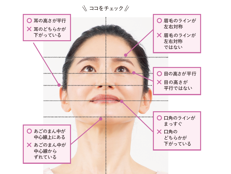 まずは顔。顔を45度上向きにした状態でスマホで自撮りをしてみましょう。撮影した写真をチェック。当てはまるものはいくつありますか?