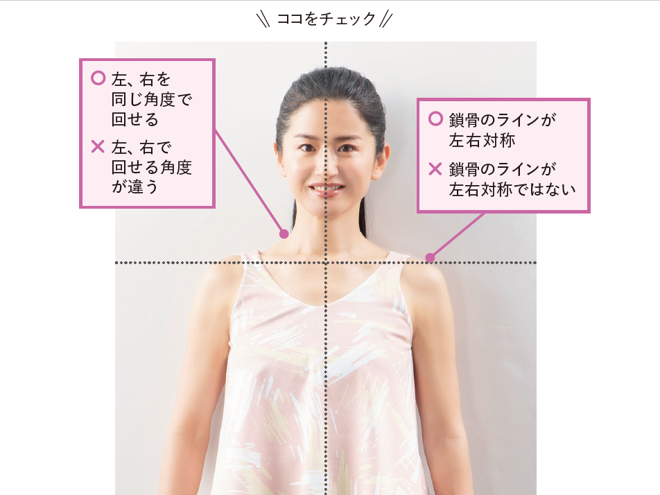 壁前に立ち、肩甲骨を壁につけます。肩が上がらないように気をつけながら、顔を左右に回してみてください。以下の項目で当てはまるものはいくつありますか?