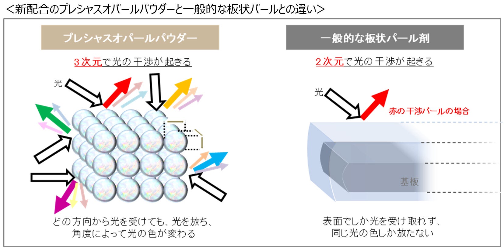 そこで今回、ファインセラミック開発事業で名高く、その独自技術を用いた合成宝石開発においても45年以上の歴史と、世界的に認められた高い品質基準を持つ京セラとの共創が実現しました。京セラと共にあしかけ10年もの共同開発期間を経て、宝石の揺らめく輝きはそのままに、合成オパール*を化粧品に初めて配合することに成功しました。
