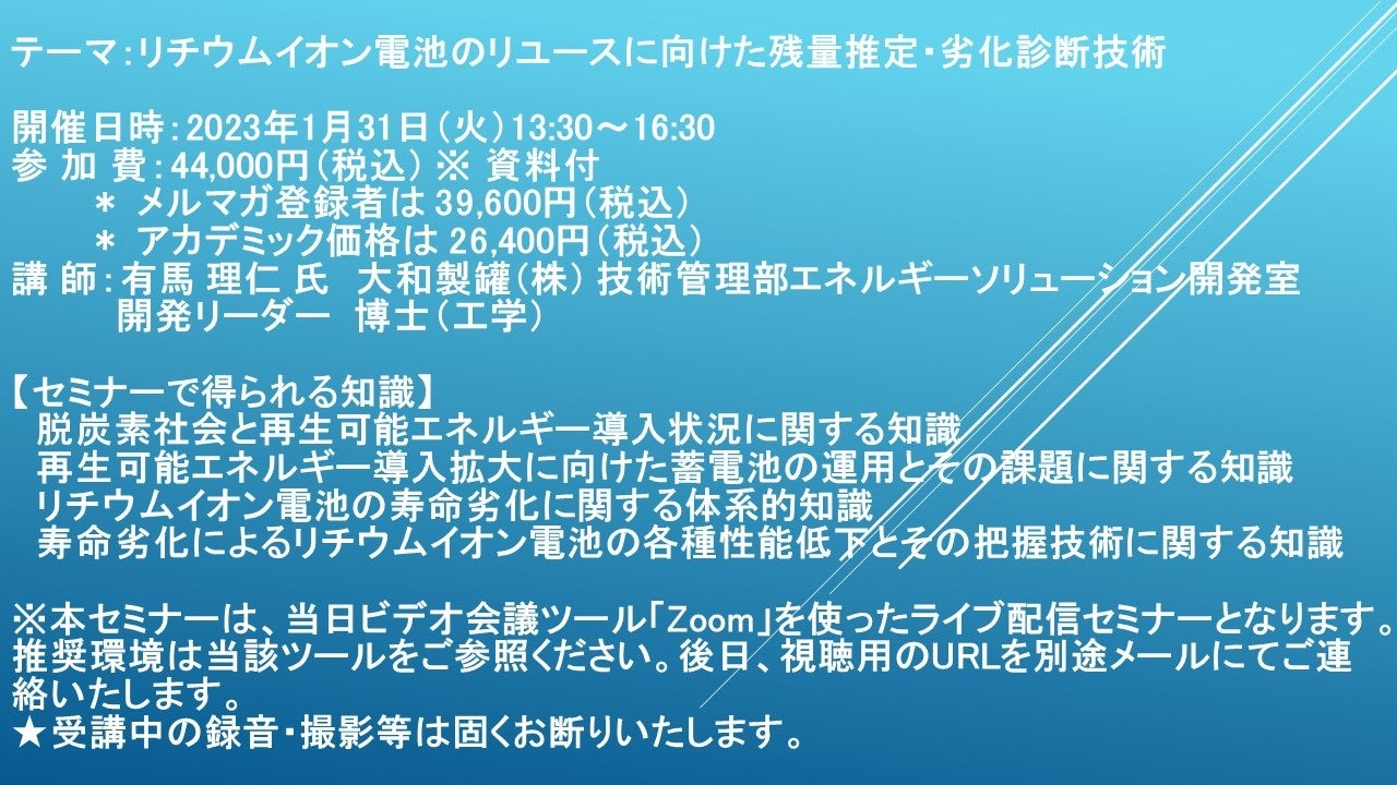 先端技術情報や市場情報を提供している(株)シーエムシー・リサーチ(千代田区神田錦町: https://cmcre.com/ )では、 各種材料・化学品などの市場動向・技術動向のセミナーや書籍発行を行っておりますが、 このたび「リチウムイオン電池のリユースに向けた残量推定・劣化診断技術」と題するセミナーを、 講師に有馬 理仁 氏 大和製罐(株) 技術管理部エネルギーソリューション開発室 開発リーダー 博士(工学))をお迎えし、2023年1月31日(火)13:30より、 ZOOMを利用したライブ配信で開催いたします。 受講料は、 一般:44,000円(税込)、 弊社メルマガ会員:39,600円(税込)、 アカデミック価格は26,400円(税込)となっております(資料付)。