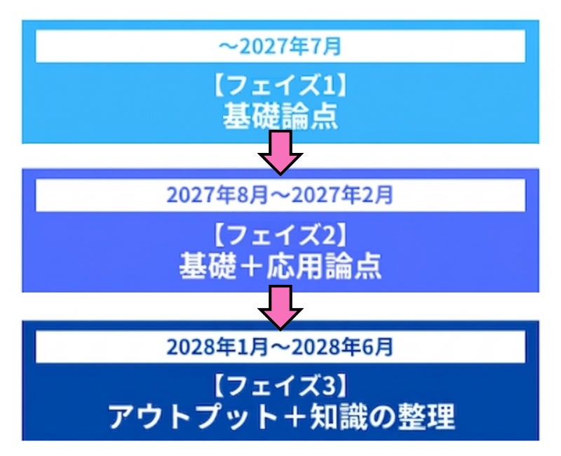 「一度学習しても、次へ進む間に忘れてしまう」という受講生の悩みに応え、本コースでは2年間という期間を最大限に活用。主要科目である「民法」を先行して徹底的に固めることで、その後の学習効率を劇的に高める設計としました。