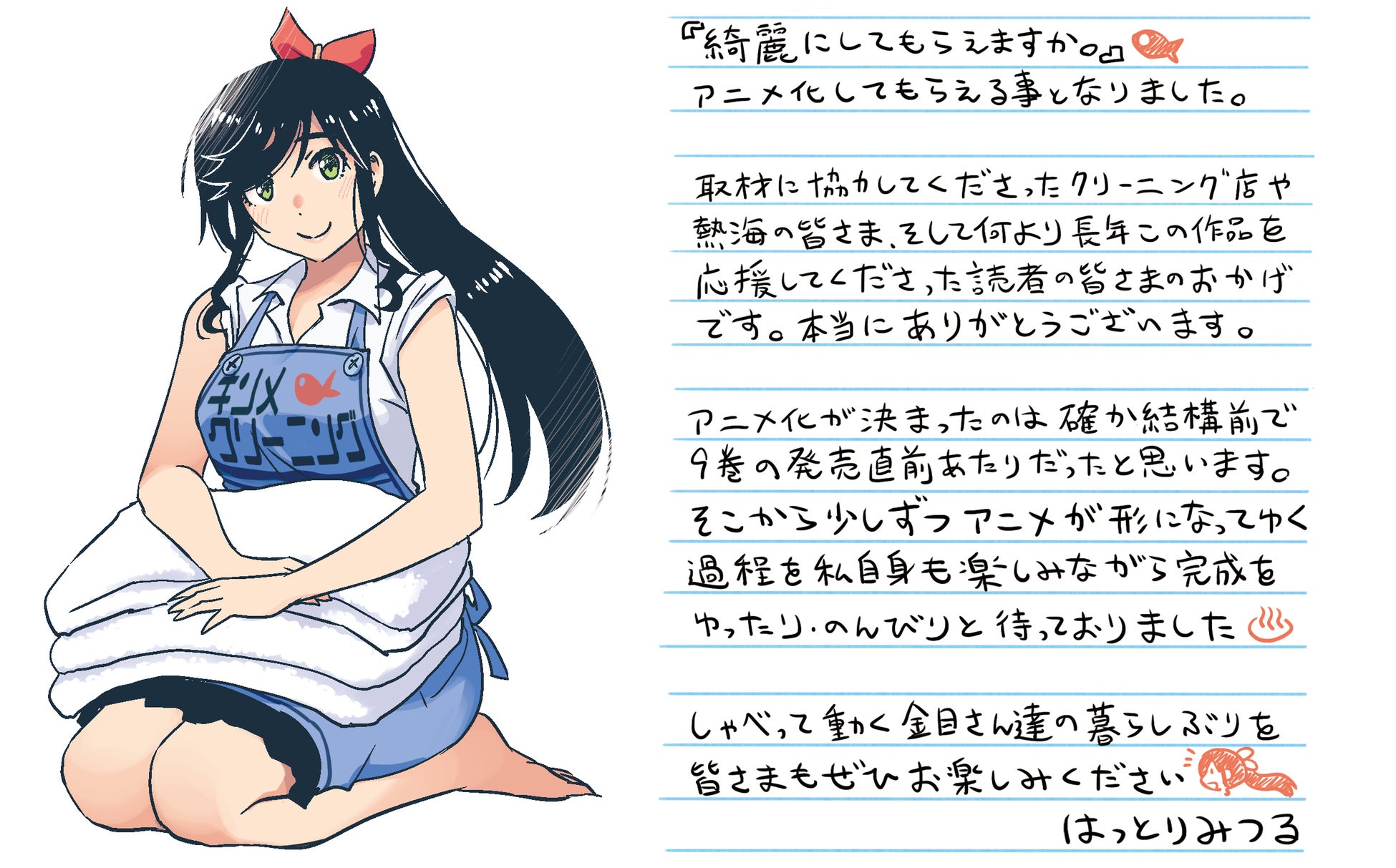 温泉が湧き出る海辺の街・熱海を舞台にした大人気ひきこもごもストーリー、『綺麗にしてもらえますか。』(掲載 「ヤングガンガン」 スクウェア・エニックス刊)が、2026年にアニメ化することが決定!本作の主人公・金目綿花奈が、自らが営むクリーニング店「キンメクリーニング」で働く姿を描いたアニメティザービジュアルも公開となります!