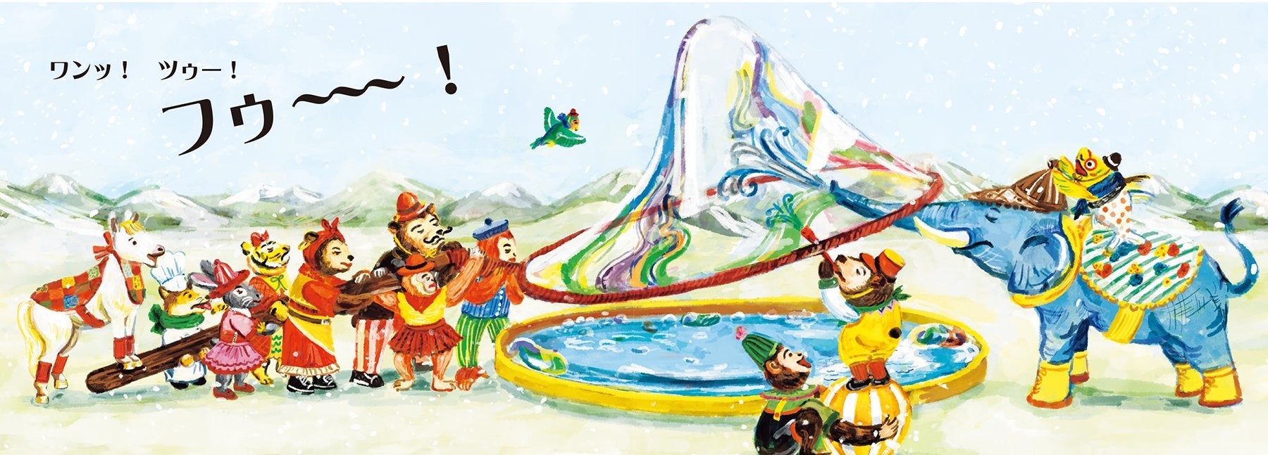 サーカス団のみんなは雪空の下でもサーカスができるよう、ドームのように大きなシャボンだまを作ります。