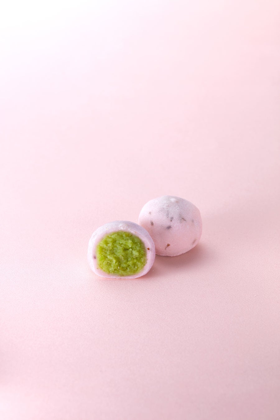 春限定の桜もなか。桜葉を加えて、やさしい桜の香りを添えた新大正もち米の皮に、なめらかで上品な甘みの北海道産小豆こし餡と羽二重粉でつくる求肥をつめました。