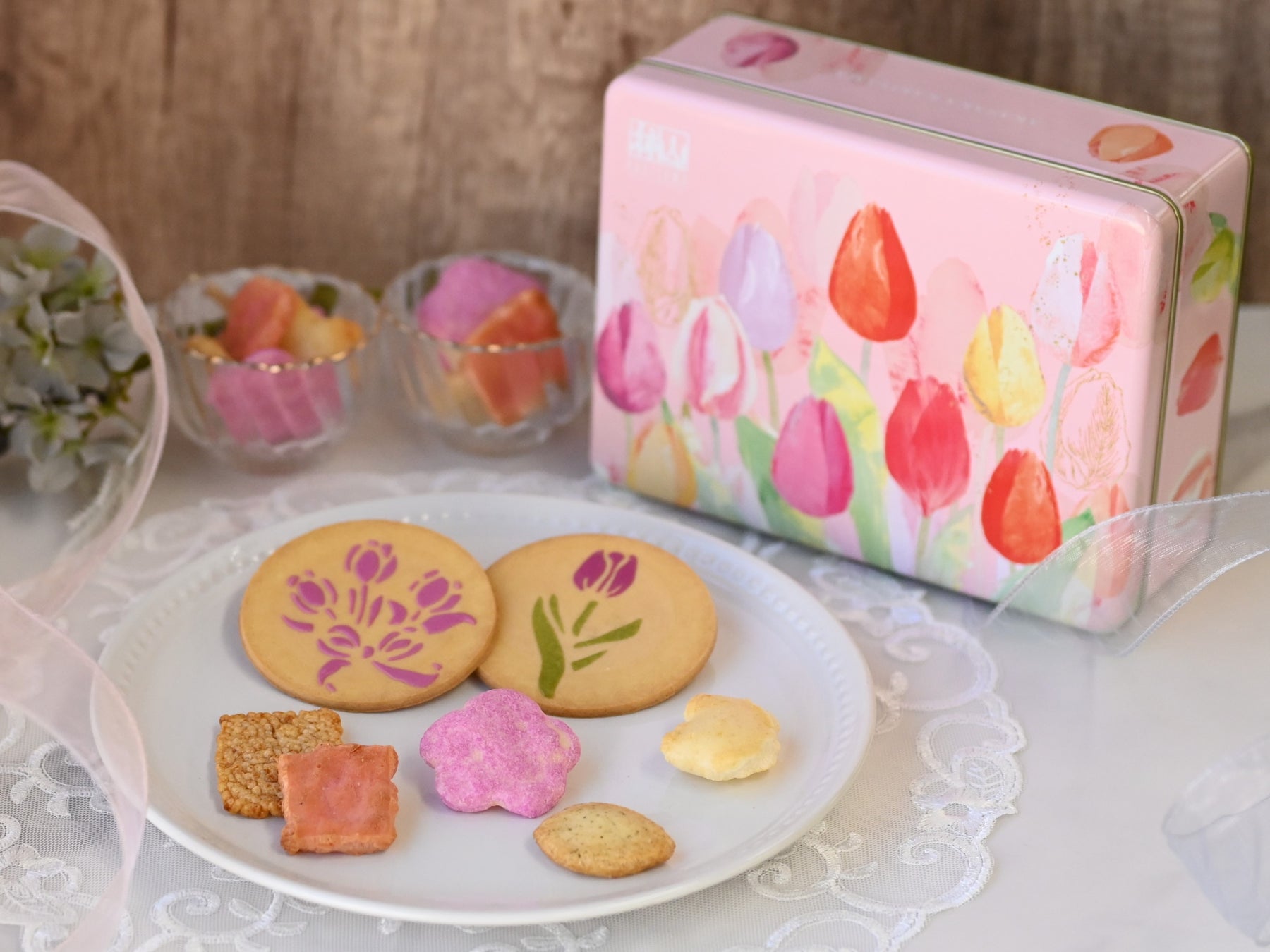 通常のヴォヤージュサブレ缶よりも大きめのギフト缶。春の訪れを感じる色とりどりのサブレがたっぷり詰まっています。