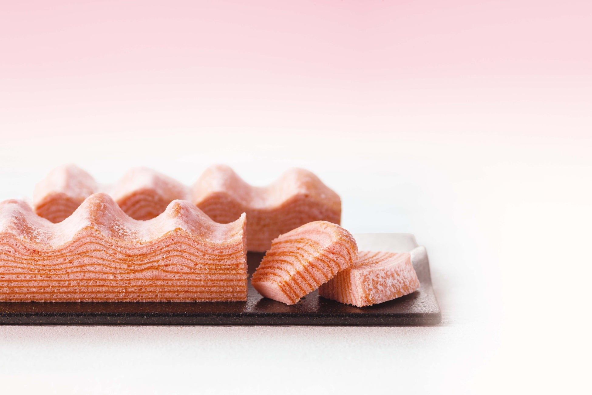 甘酸っぱい「とちおとめ」のペーストを生地に練り込んで一層一層焼き上げました。ホワイトショコラと合わせてコク豊かでミルキーに。苺の香り華やぐ、春色の新作。