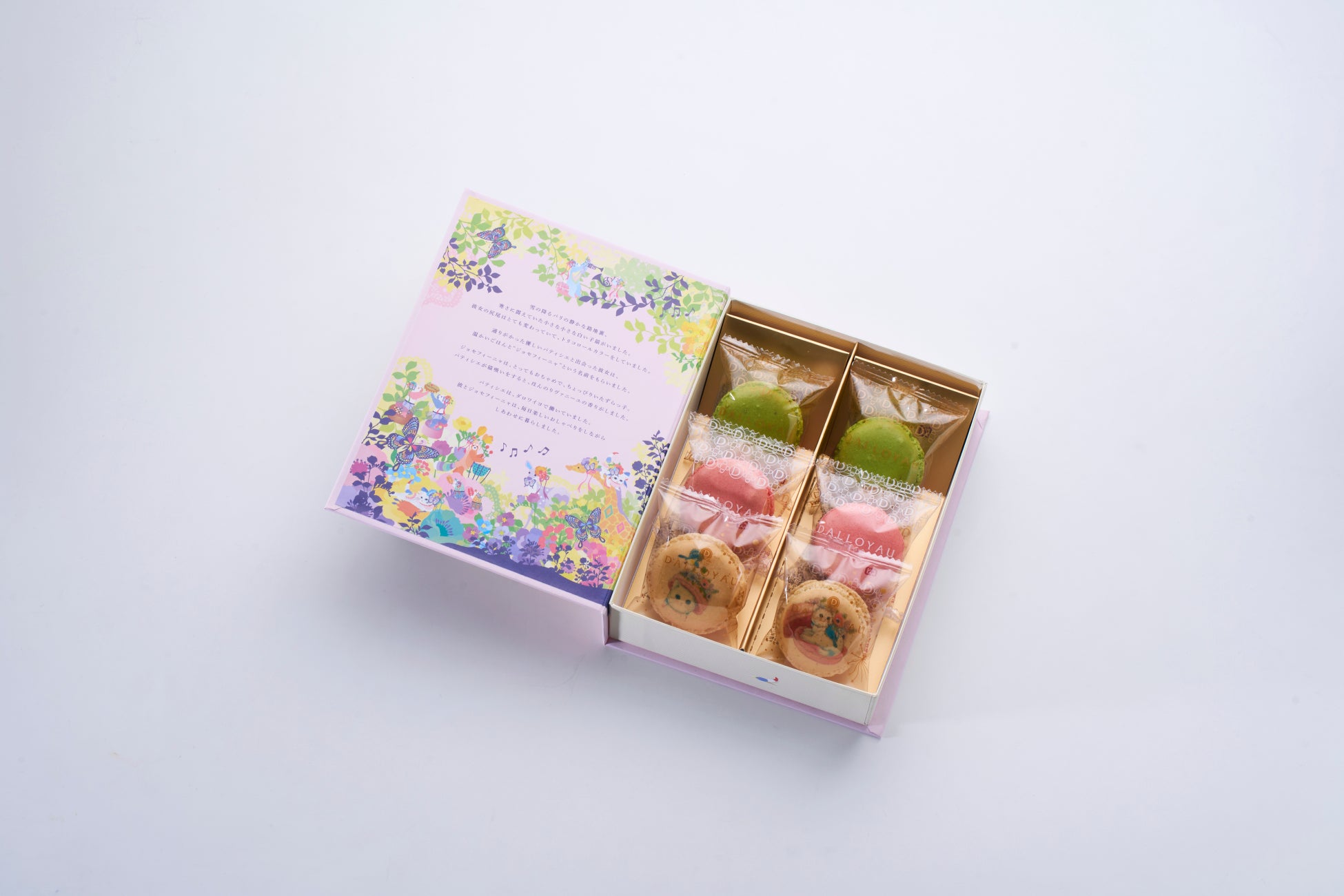 ホラグチカヨさんがデザインした限定パッケージに、期間限定マカロンを詰め合わせ。ジョセフィーニャをプリントしたマカロン2種類と、限定フレーバー桜とフレーズピスターシュ2種類が入っています。