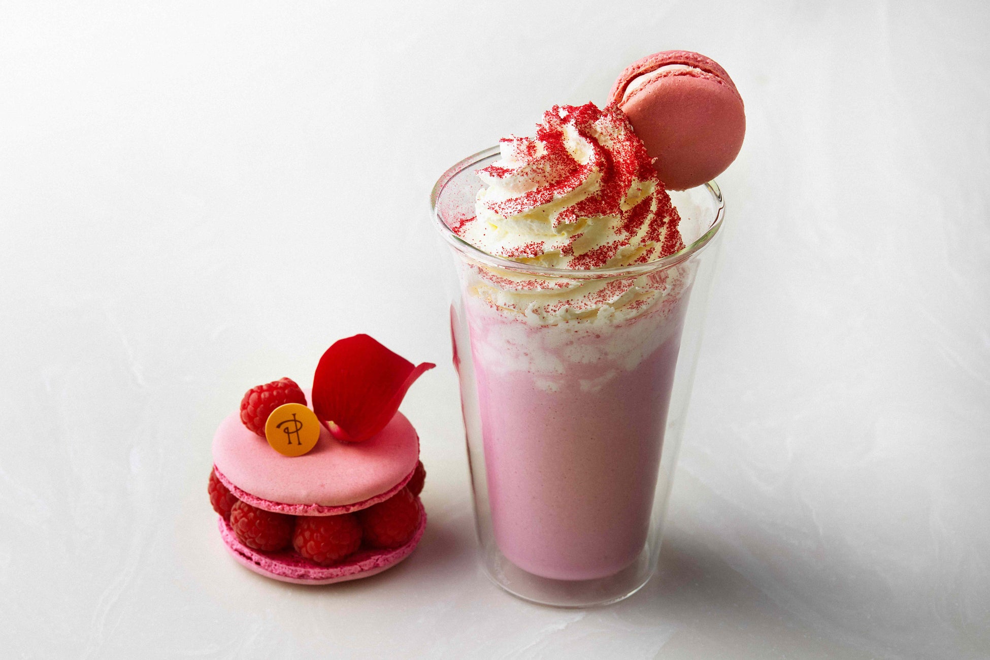 -ピエール・エルメ・パリの季節のアフタヌーンティーで、涼やかなひとときを過ごしてみませんか。暑い夏にぴったりの人気フレーバーをアレンジした「マカロンフラッペ」もご用意しております。上品な甘さが広がる〈抹茶〉と、バラ・ライチ・フランボワーズが織りなす華やかな〈イスパハン〉の2種を、ぜひお楽しみください。