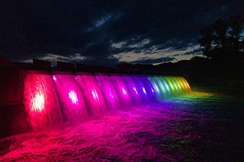 岩手県西和賀町にあるダム。「錦秋湖大滝」は、数メートルの高さから落下する水がカーテンのように見える絶景スポット。ダムの水位が低下する7月~10月上旬に見られ、ダムの堤体内から見学することも可能。9月11日までは虹色、9月12日~10月9日は秋をイメージした3色(朱・山吹・黄)にライトアップされ、残暑厳しい季節でも涼やかなひとときを過ごせる。