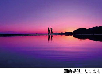 瀬戸内海国立公園内に属する景勝地で関西随一の遠浅海岸。干潮時には浜辺から約500m、東西約1.5kmの広大な干潟が現れ、春には潮干狩り、夏には海水浴でにぎわうスポット。ここでは、秋から冬の夕刻に条件が揃えば、一面がオレンジに染まるリフレクション絶景を見られると近年SNSで話題に。まるでウユニ塩湖のような一枚が撮れるかも!