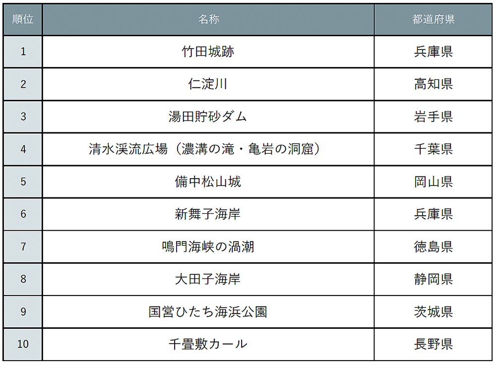 まだまだ残暑厳しい中でも、少しずつ秋の気配を感じる9月。そんな今だからこそ楽しめる絶景が日本各地にはたくさんあることをご存知でしょうか。そこで今回は「秋に出会える旬絶景」についてアンケートを実施しました。1位は兵庫県「竹田城跡」。“日本のマチュピチュ”ともいわれる天空の城の代表的存在として、数年前から注目を集めているスポット。その幻想的な雰囲気はまさに別世界のような美しさ!続く2位は高知県「仁淀川」。青く透き通る“仁淀ブルー”は、9月により一層美しさが増すのだとか。そして3位にはライトアップが魅力的な岩手県「湯田貯砂ダム」がランクイン。そのほかTOP10には、夕陽に紅葉、渦潮などバラエティー豊かな秋絶景が並ぶ結果となりました。