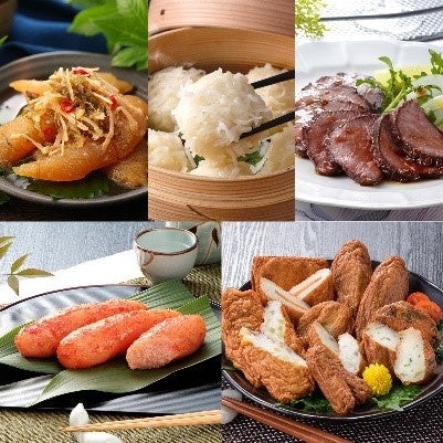●「福さ屋」無着色辛子めんたい切子150g/●「タケダハム」ローストビーフ140g ソース、レホール付/●「竹田食品」数の子松前 130g/●「木屋」いかしゅうまい8粒入/●「中新商店」さつまあげ2袋計424g/●「唐津くん煙工房」あらびきウインナー120g×2/●「ふくみ屋」角煮卓袱まんじゅう70g×3/●「博多華味鳥」料亭の卵ぷりん108g×3/●「林兼産業」霧島黒豚煮込みハンバーグ360g(3個)/●「アマタケ」岩手あい鴨 鴨鍋セット(あい鴨肉スライス200g、鴨入りだんご100g、鍋つゆ50g×2) /●「小浜海産物」小鯛ささ漬 70g/●「川秀」たっぷり漬け ほたて 100g