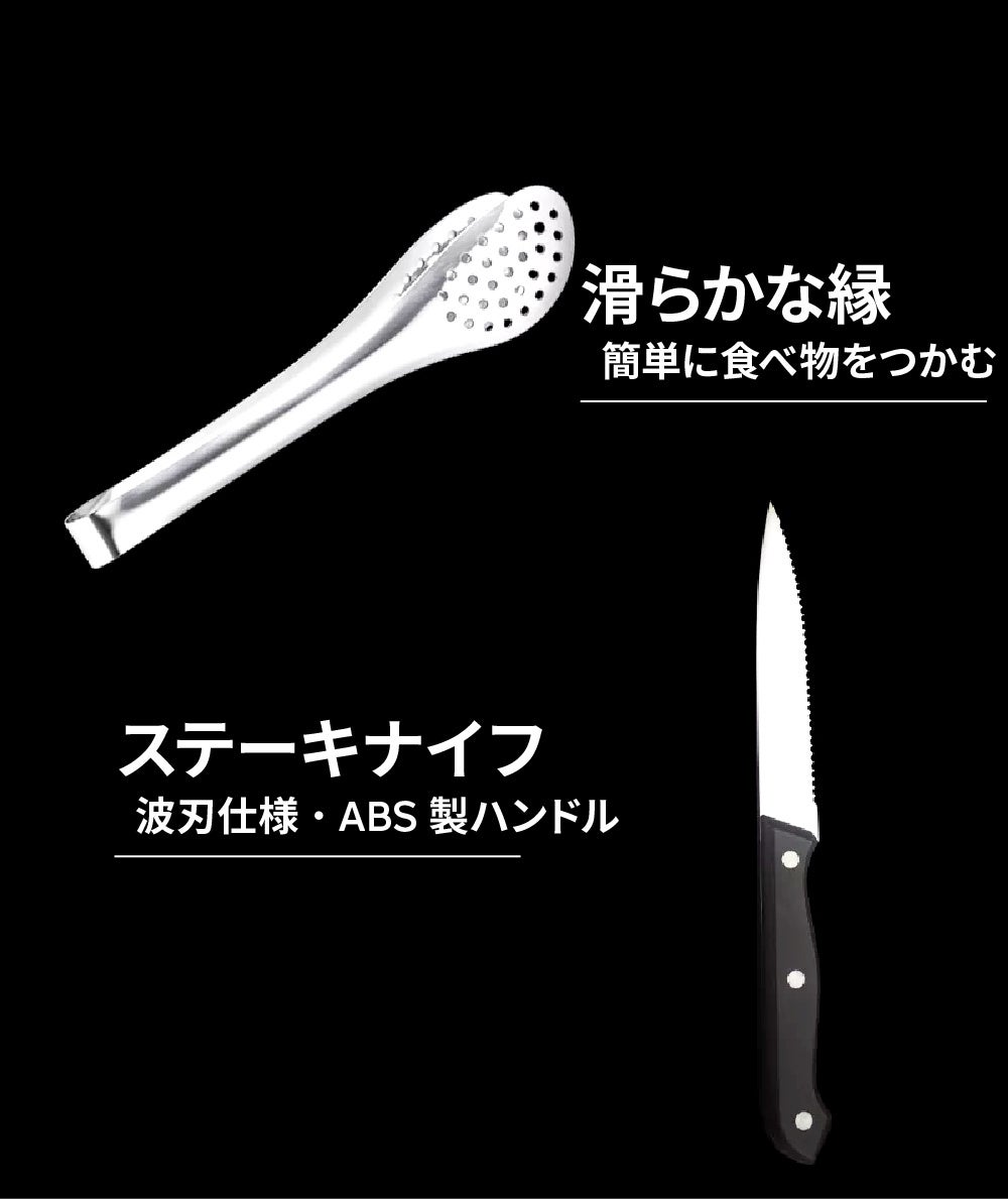 また、ステーキナイフは波刃仕様で、ハンドルはより丈夫なABS製となっており、アウトドアでも使いやすい設計となっています。