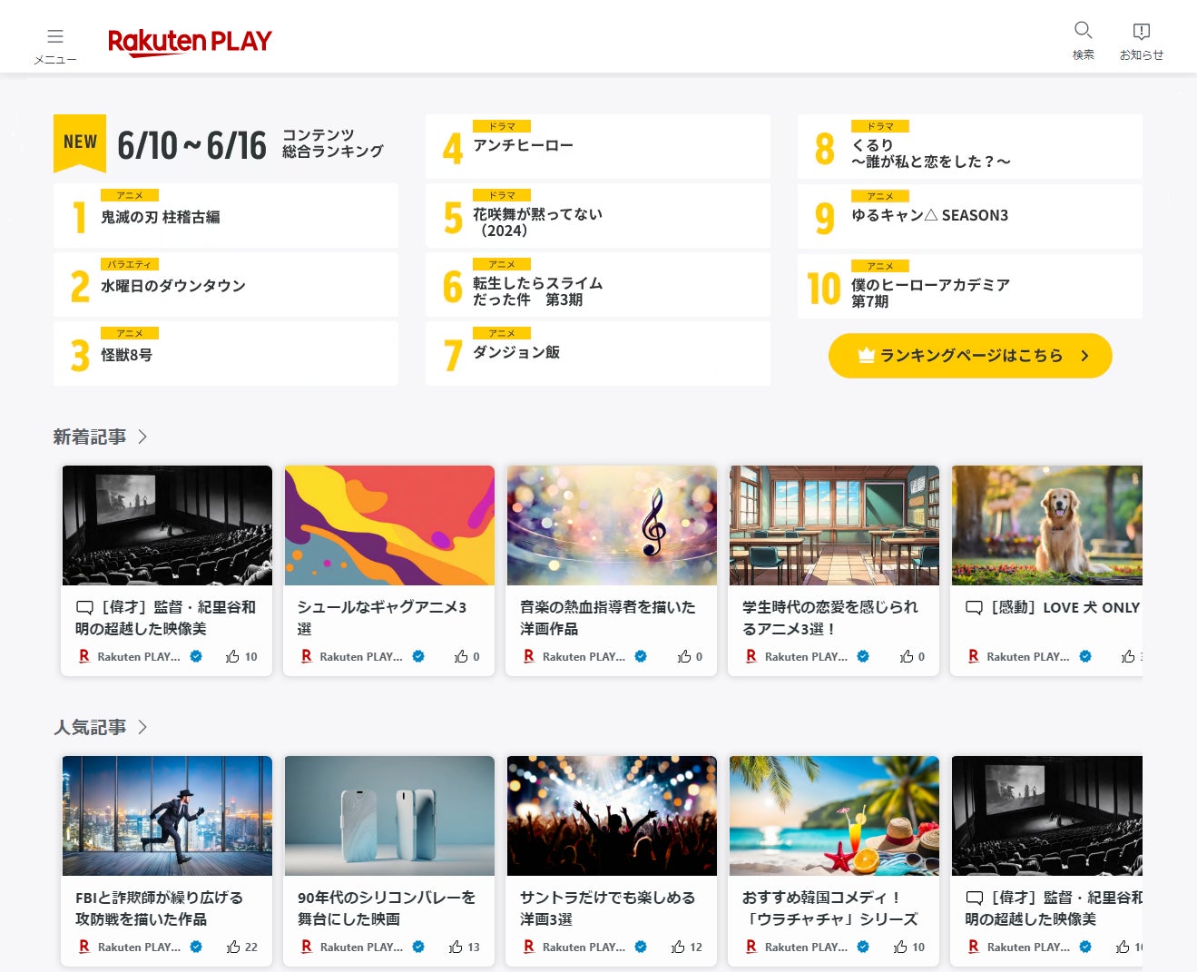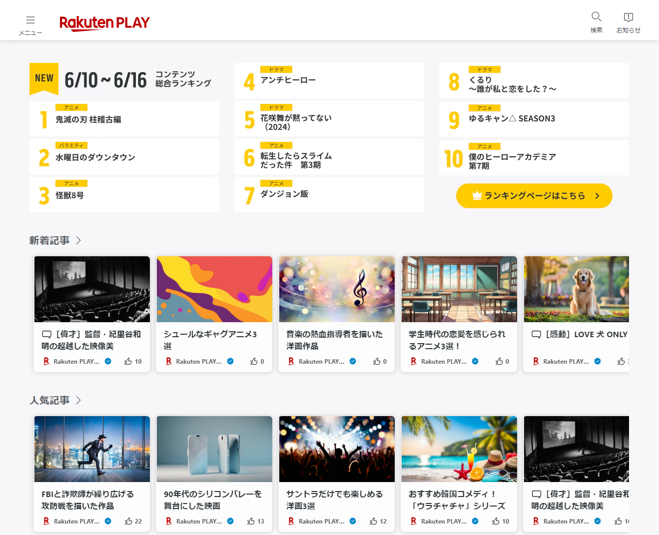 「Rakuten PLAY」は、幅広い動画コンテンツの情報を提供する無料のサービスです。ユーザーは、アンケート調査をもとに独自で算出した動画配信サービス横断型の「コンテンツ総合ランキング」(注1)や、視聴したコンテンツを他のユーザーにおすすめすることができる記事作成機能などを通じて、映画やドラマ、アニメなど幅広いジャンルのコンテンツと出会うことが可能です。また、本サービスを通じて各有料動画配信サービスに申し込むと、「楽天ポイント」を獲得することができます(注2)。