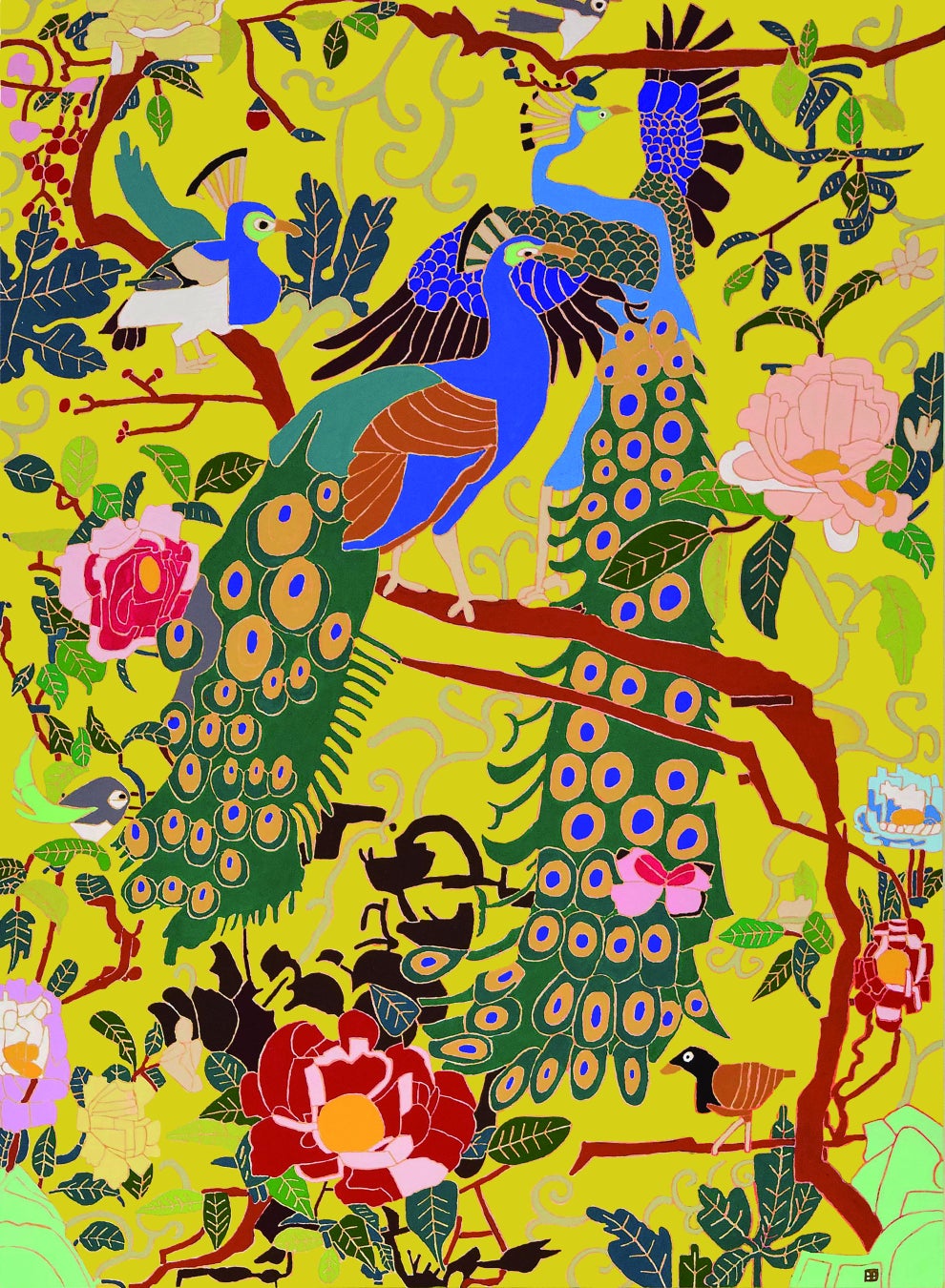 田中の作品は、直線ではなく曲線を重ねる独自の表現により、動物や植物の躍動感を書き出している点が特徴です。また、細部まで色を塗り分ける点も特徴であり、古代の織物などをモチーフにした絵画を描きます。