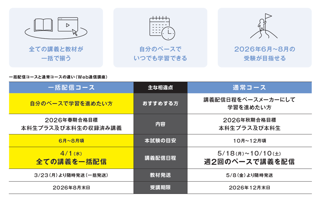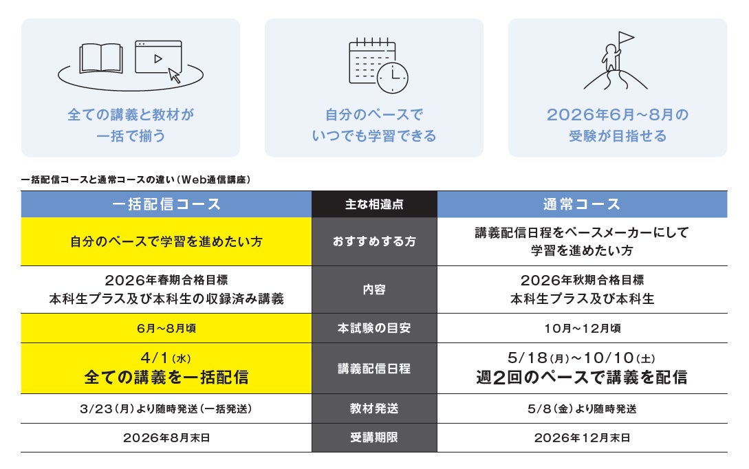 全ての講義が受講開始後、すぐに視聴可能であるため、ご自身で自由に学習スケジュールを組み立てることができます。配信講義及び配付教材は2026年春期合格目標と同一です。(受講期限は2026年8月末日までとなります。お申込みの際はご注意ください)
