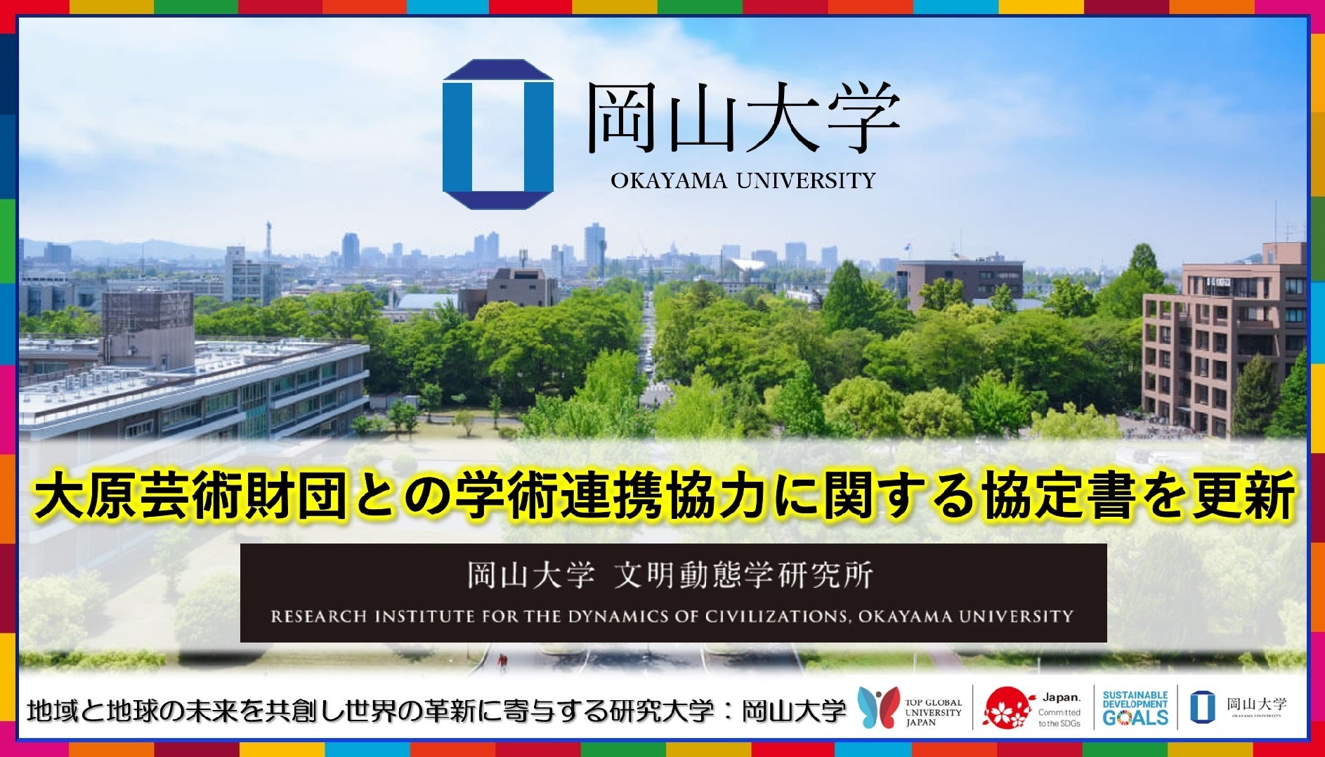国立大学法人岡山大学(本部:岡山市北区、学長:那須保友)は2024年4月1日、公益財団法人大原芸術財団(大原芸術財団)との学術連携協力に関する協定の更新に関する合意書を締結しました。