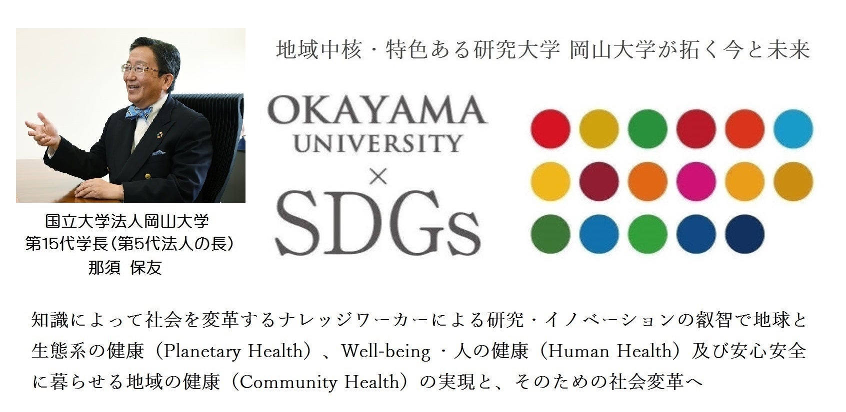 国立大学法人岡山大学は、国連の「持続可能な開発目標(SDGs)」を支援しています。また、政府の第1回「ジャパンSDGsアワード」特別賞を受賞しています。地域中核・特色ある研究大学として共育共創を進める岡山大学にご期待ください