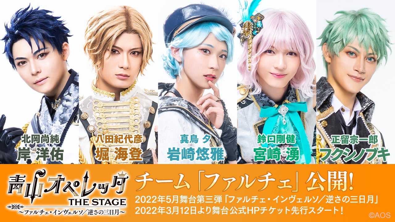 舞台チケットは、2022年3月12日(土)から公式HP先行がスタートします。新キャラクターの登場でますます盛り上がる『青山オペレッタ THE STAGE ~ファルチェ・インヴェルソ/逆さの三日月~』をお楽しみに!