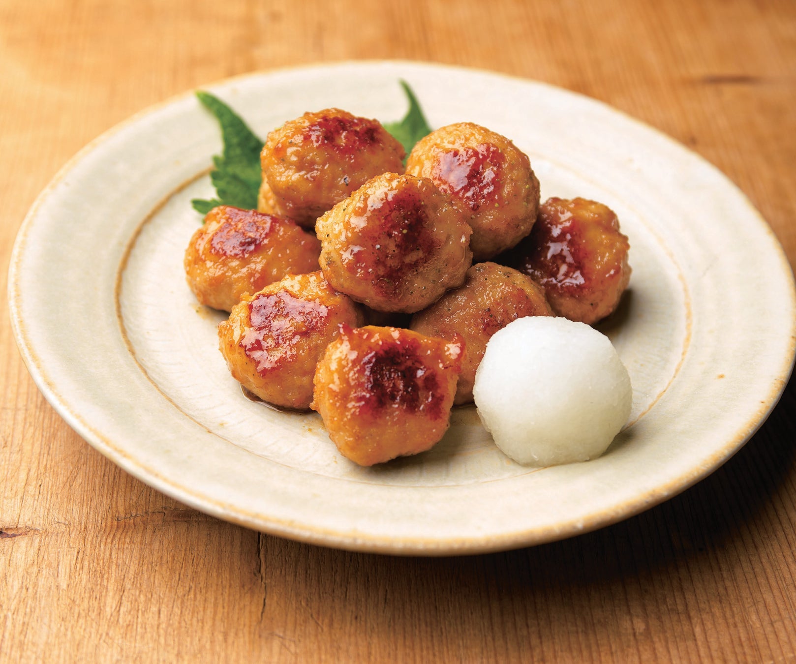 ⑥焼き色がついたらCを加え、とろっとするまで煮詰めてつくねにからめ、粉山椒をふる。器に盛り、大根おろしと青じそを添える。