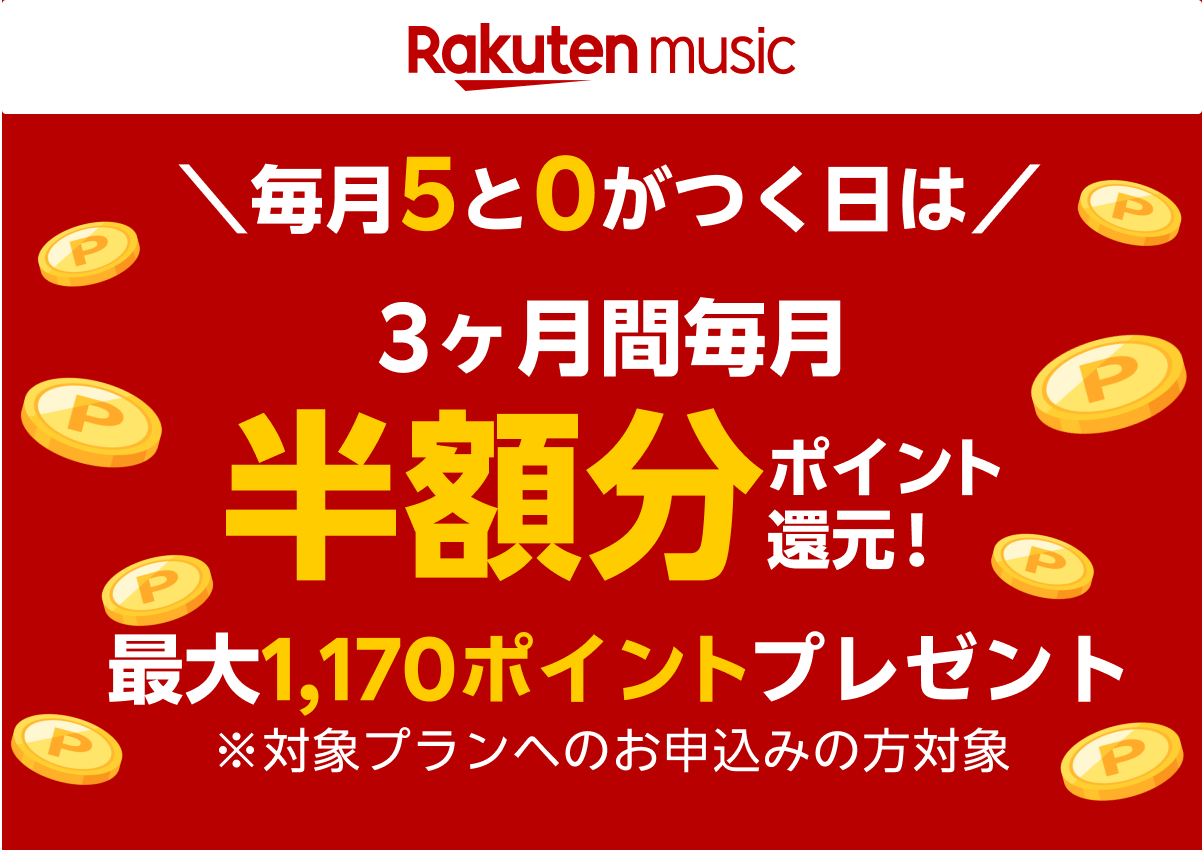 ・内容: 「楽天モバイル」または「楽天カード」のユーザーを対象に、「Rakuten Music」へ毎月5と0がつく日に、楽天IDでログインのうえ、キャンペーンコードを入力して「楽天モバイル・カード会員プラン」に新規入会、または再入会すると、最大3回まで「楽天ポイント」を毎月390ポイントずつ(最大1,170ポイント)進呈