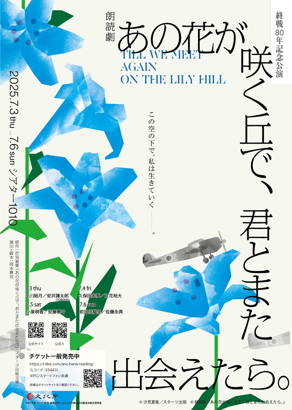 2025年7月3日から上演する朗読劇『あの花が咲く丘で、君とまた出会えたら。』が文化庁の劇場・音楽堂等における子供舞台芸術鑑賞体験支援事業に採択されました。18歳以下のお子様を無料でご招待いたします。
