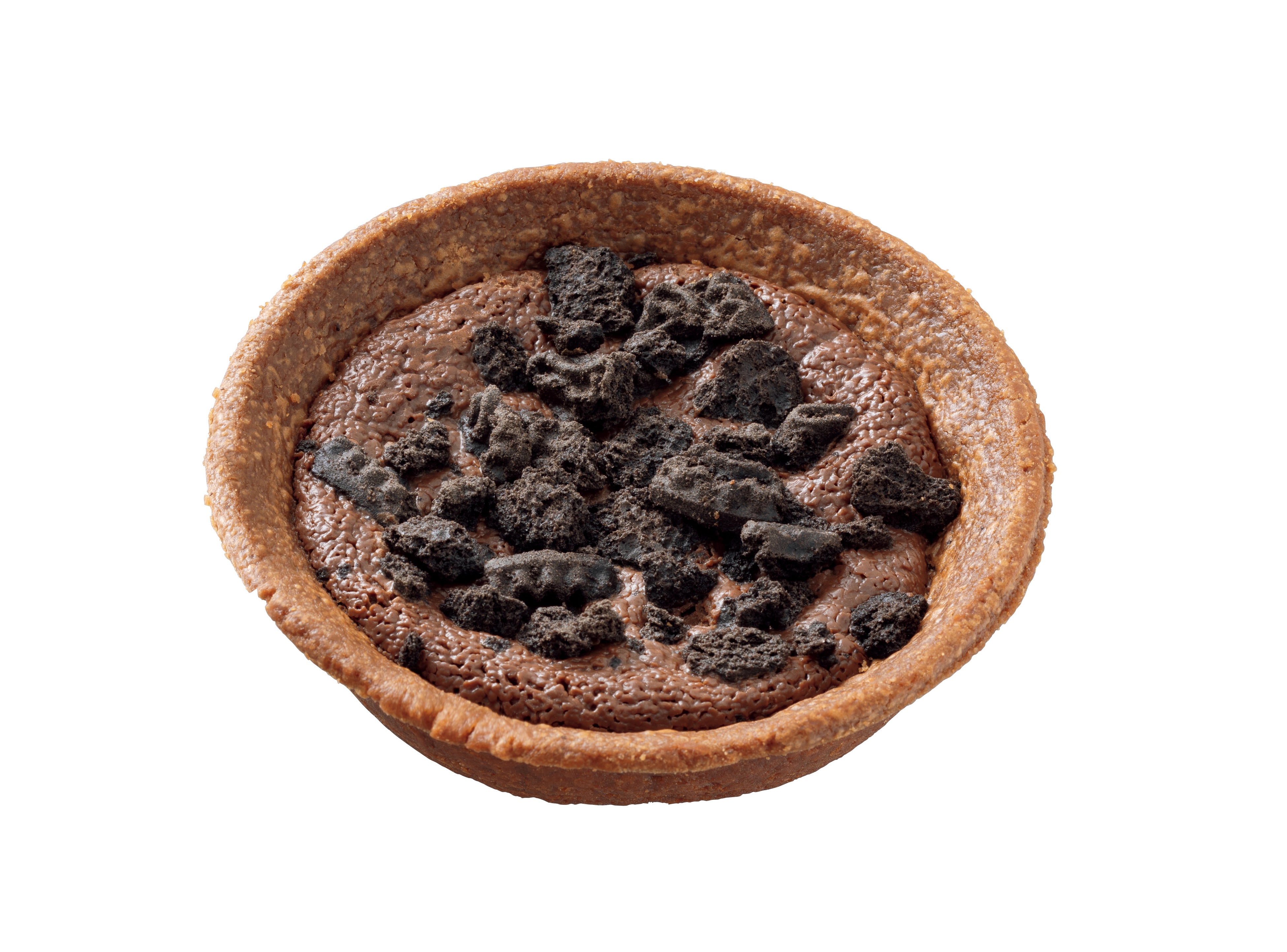 【内容】ブラックサンダーをイメージしたチョコタルトです。ココアタルトに、チョコチップとチョコ生地を入れ、ココアビスケットをトッピングし、焼き上げました。ザクサク食感が楽しめます。