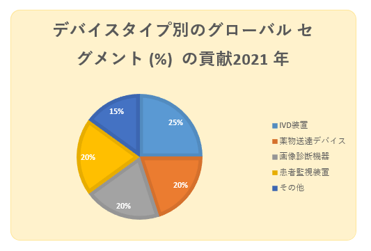 デバイス タイプ セグメントは、IVD デバイス、ドラッグ デリバリー デバイス、画像診断デバイス、患者モニタリング デバイス、およびその他の 3 つのタイプにサブセグメント化できます。これらのうち、IVD デバイスが最大の市場シェアを占めています。IVD 装置の魅力的な要素は、世界中で入手可能性が高まっていることです。さらに、ポイント オブ ケア検査の使用は、完全に自動化された機器と検査室の自動化の使用とともに増加すると予想されます。また、COVID 19 の診断の大部分は、IVD デバイスを使用して行われます。これらの要因により、IVD デバイス サブセグメントは 20% 以上の市場シェアを保持しています。
