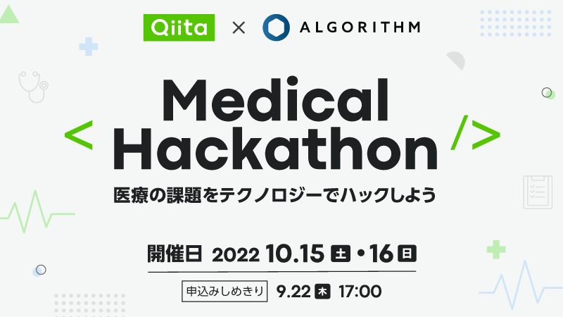 10月15日(土)・16日(日)の2日間に渡り、「Qiita×Algorithm Medical Hackathon 医療の課題をテクノロジーでハックしよう」をテーマに、医療DXを実現するウェブサービス、モバイルアプリの開発をアルゴリズム社本社にて行っていただきます。