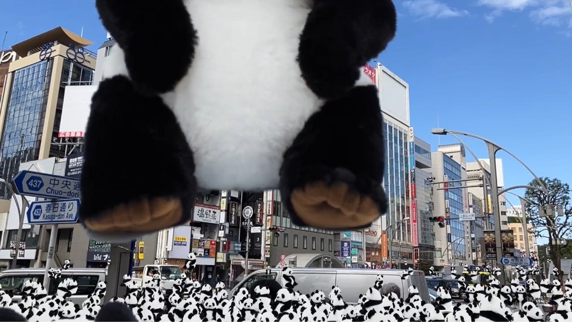 シーンの紹介ⅱ:上野広小路の交差点に巨大なパンダが遠くから降ってきて、街にあふれたパンダと共に街を彩ります。