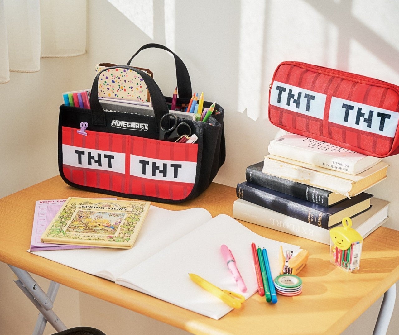 特別アイテムは、敵対的モブの「クリーパー」と爆破ブロック「TNT」デザインのインテリアトートとロングポーチのセットです。インテリアトートは、外ポケットと内ポケットが付いていて、おもちゃやお菓子、ノート、コスメなどをすっきり収納可能です。ロングポーチは、ゲーム機やギア、文房具、イヤホン、充電器などをきれいに収納できます。また、ポーチはトートにピッタリ入るサイズ感。マインクラフトの世界感を楽しみながら、かたづけがはかどること間違いなしのセットアイテムです。