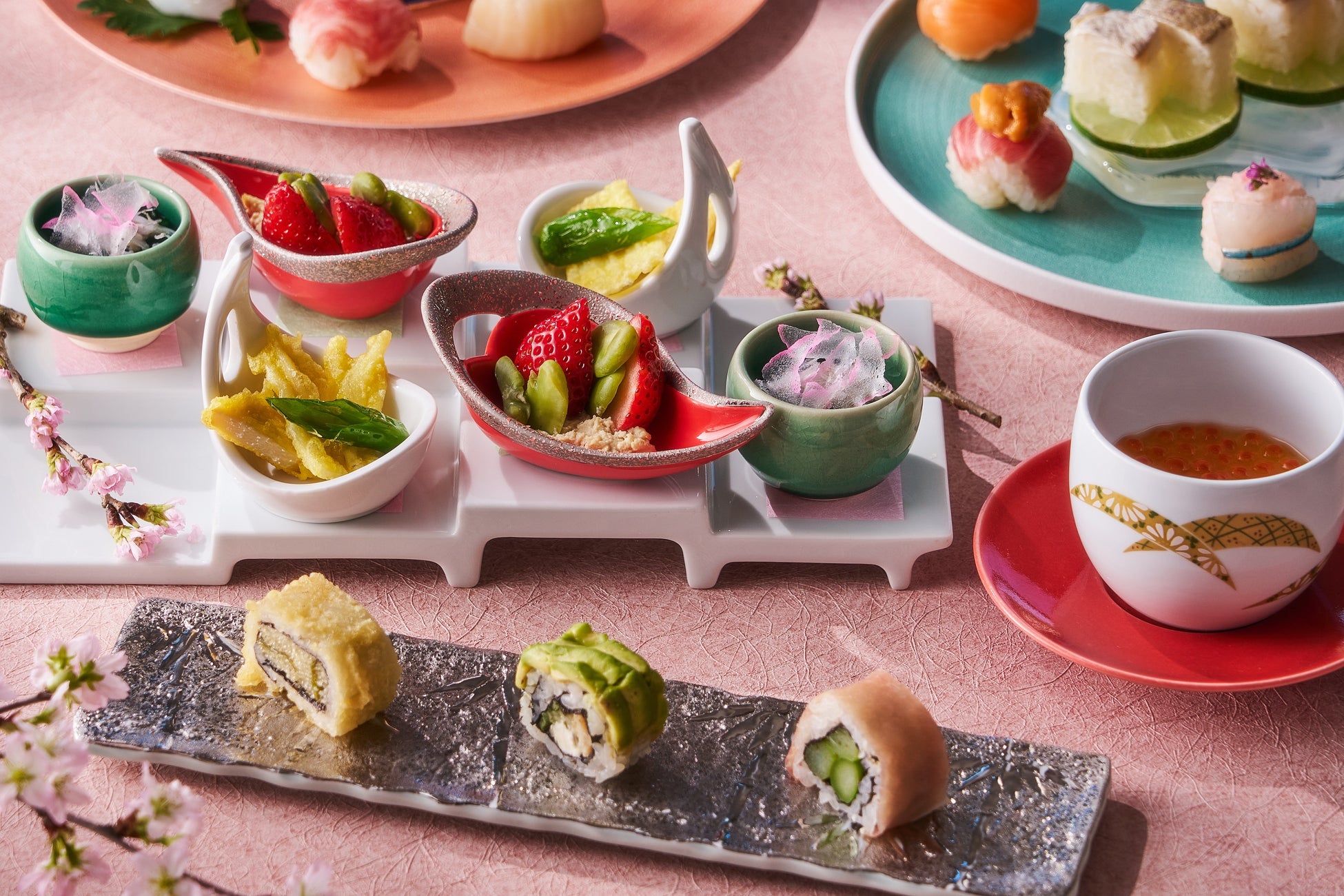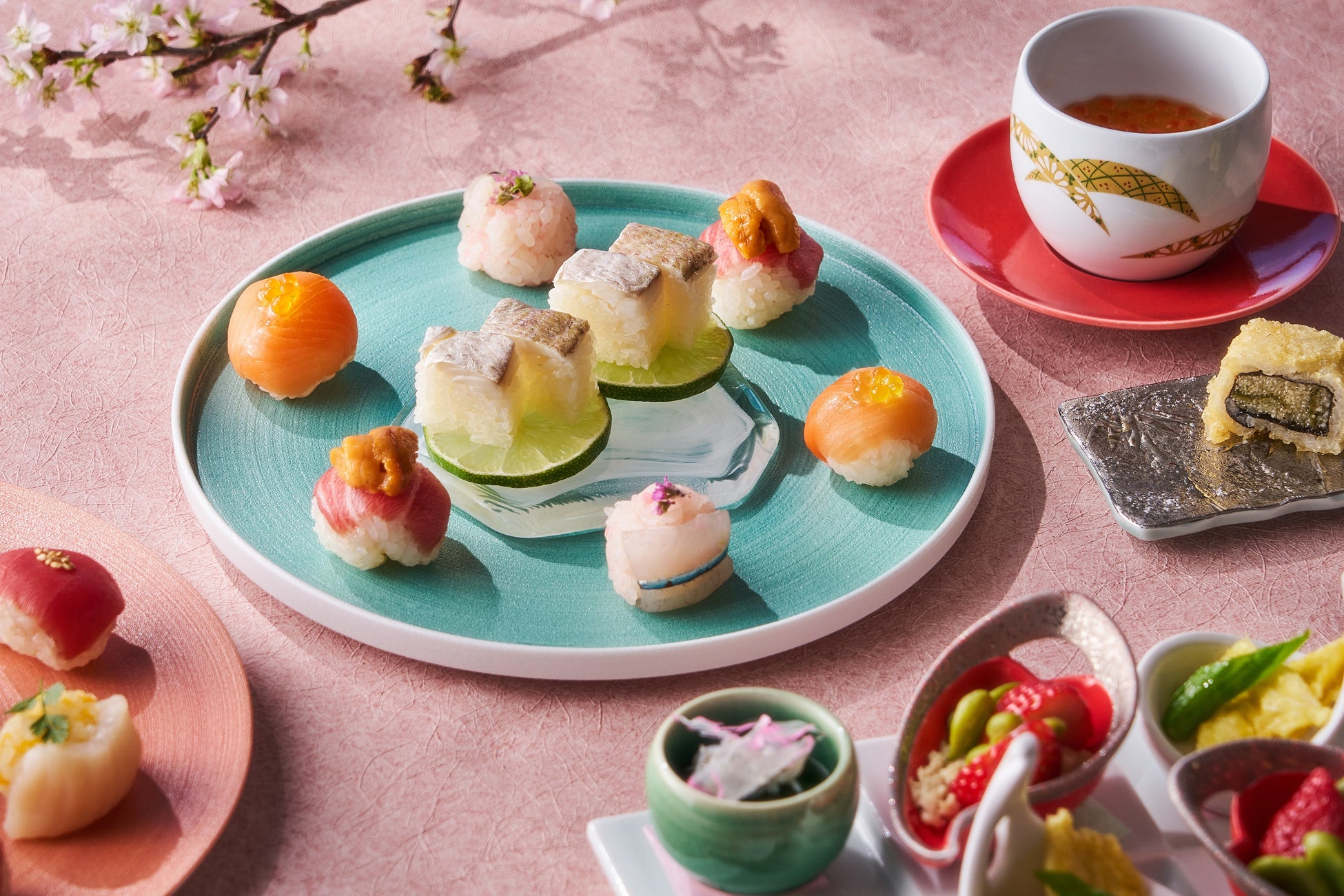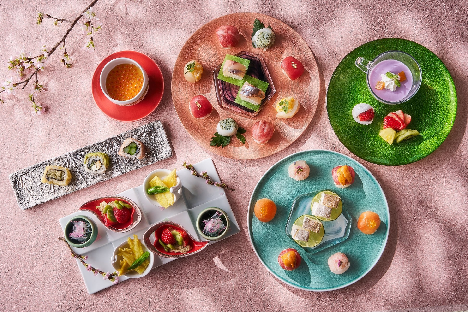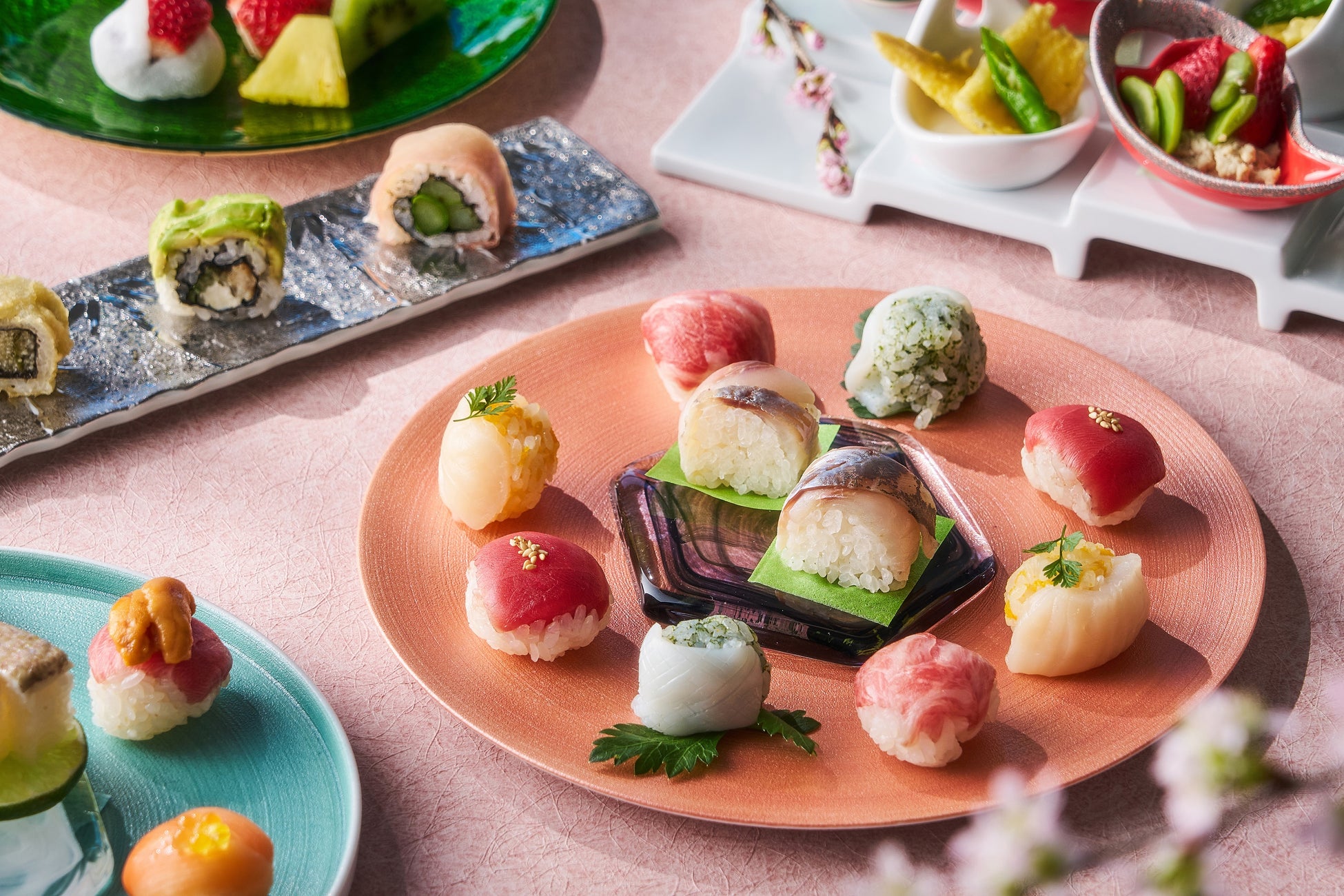 これから桜がピンク色、草木は緑色にと街がカラフルになる春の季節。当ホテルから望める美しい景色と共に春の食をお楽しみいただこうと、職人が手毬やロールスタイルで作る12種類の寿司や、季節のデザートプレートなどをアフタヌーンティーとしてご用意しました。