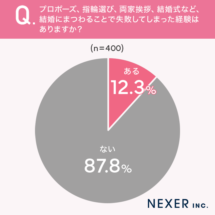 結果として、12.3%の方が「失敗した経験がある」と回答しました。およそ8人に1人が何らかの失敗を経験していることがわかります。一方で、87.8%の方は「ない」と回答しており、大多数の方は結婚に関するイベントを順調に終えているようです。