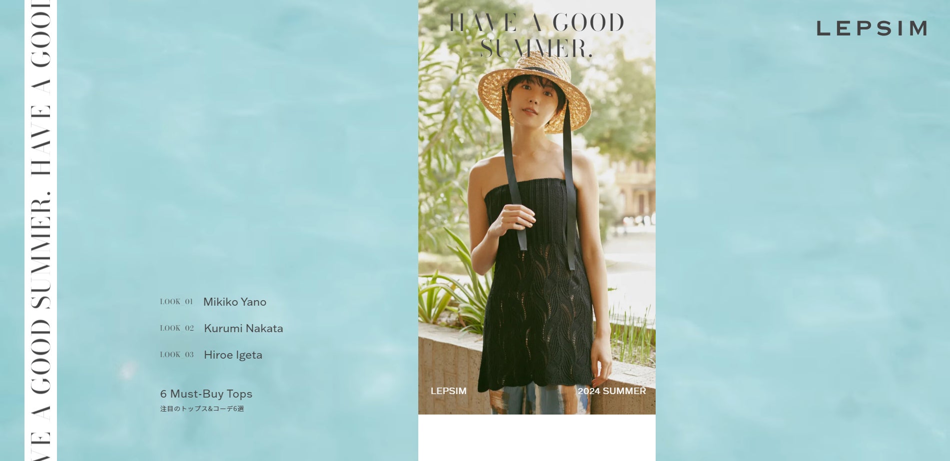 「Play fashion!」をミッションに掲げ、”グッドコミュニティ共創カンパニー”を目指す株式会社アダストリア(本部:東京都渋谷区渋谷2-21-1、代表取締役社長:木村 治)が展開する「LEPSIM(レプシィム)」は、モデル・矢野未希子さん、女優・中田クルミさん、女優・井桁弘恵さんが“Have a good summer.” をテーマに夏の大人カジュアルスタイルを着こなす、夏のブランドビジュアルを2024年5月15日(水)にレプシィムの各店舗と公式WEBストア .st(ドットエスティ)にて公開いたします。同日20:00より、中田クルミさんが登場するインスタライブをレプシィム公式Instagramにて配信。撮影時の裏話や着こなし方のポイントなど、このライブでしか聞けないエピソードを展開します。