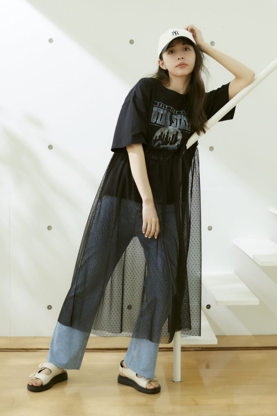 Tシャツとチュールがドッキングしたリメイク風ワンピースを主役に、淡いブルーのデニムパンツを合わせた大人カジュアルコーデ。スポーティなキャップやベルトサンダルなどの小物でハズすと、バランスよく着こなせます。