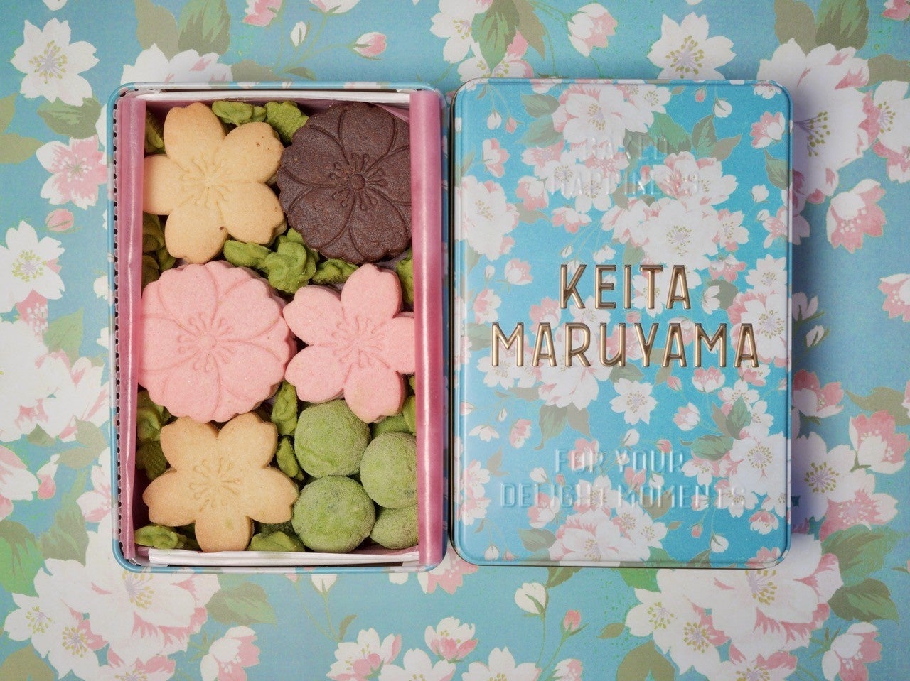 ➀春の訪れを感じるような桜モチーフのクッキー缶。人気の満開の桜をプリントしたオリジナル缶に、今年は新色ブルーが登場。
