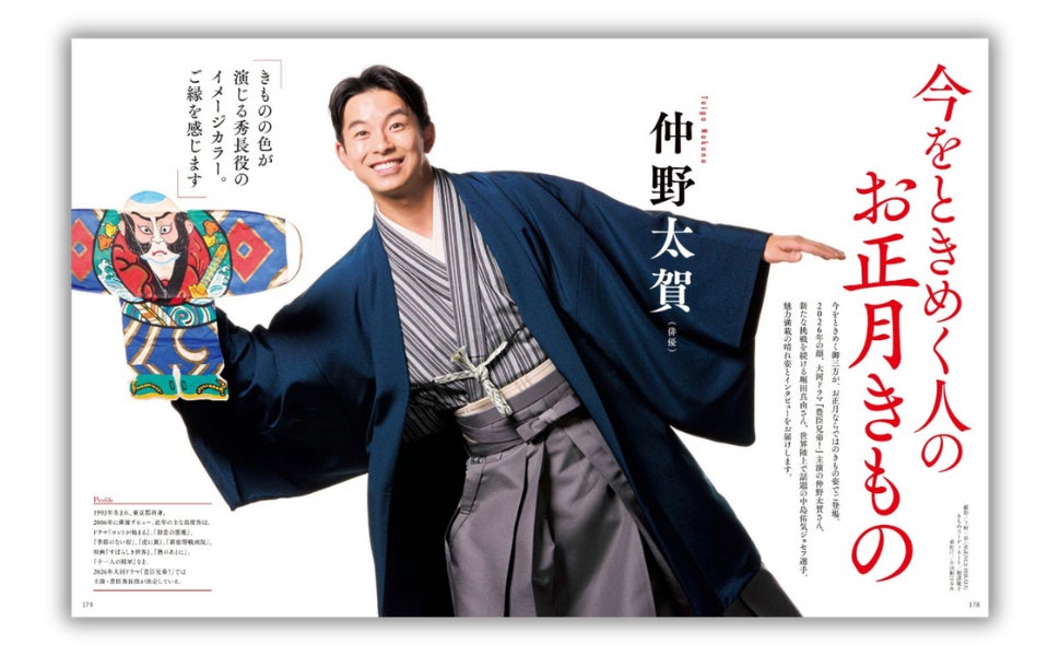 2026年のNHK大河ドラマ『豊臣兄弟!』で主演を務める仲野太賀さん、デビュー10周年を駆け抜け新たなスタートを切る俳優・堀田真由さん、「東京2025世界陸上」の男子400メートルで6位入賞を果たした中島佑気ジョセフさん。今をときめく御三方の魅力満載の晴れ着姿とインタビューをお届けします。