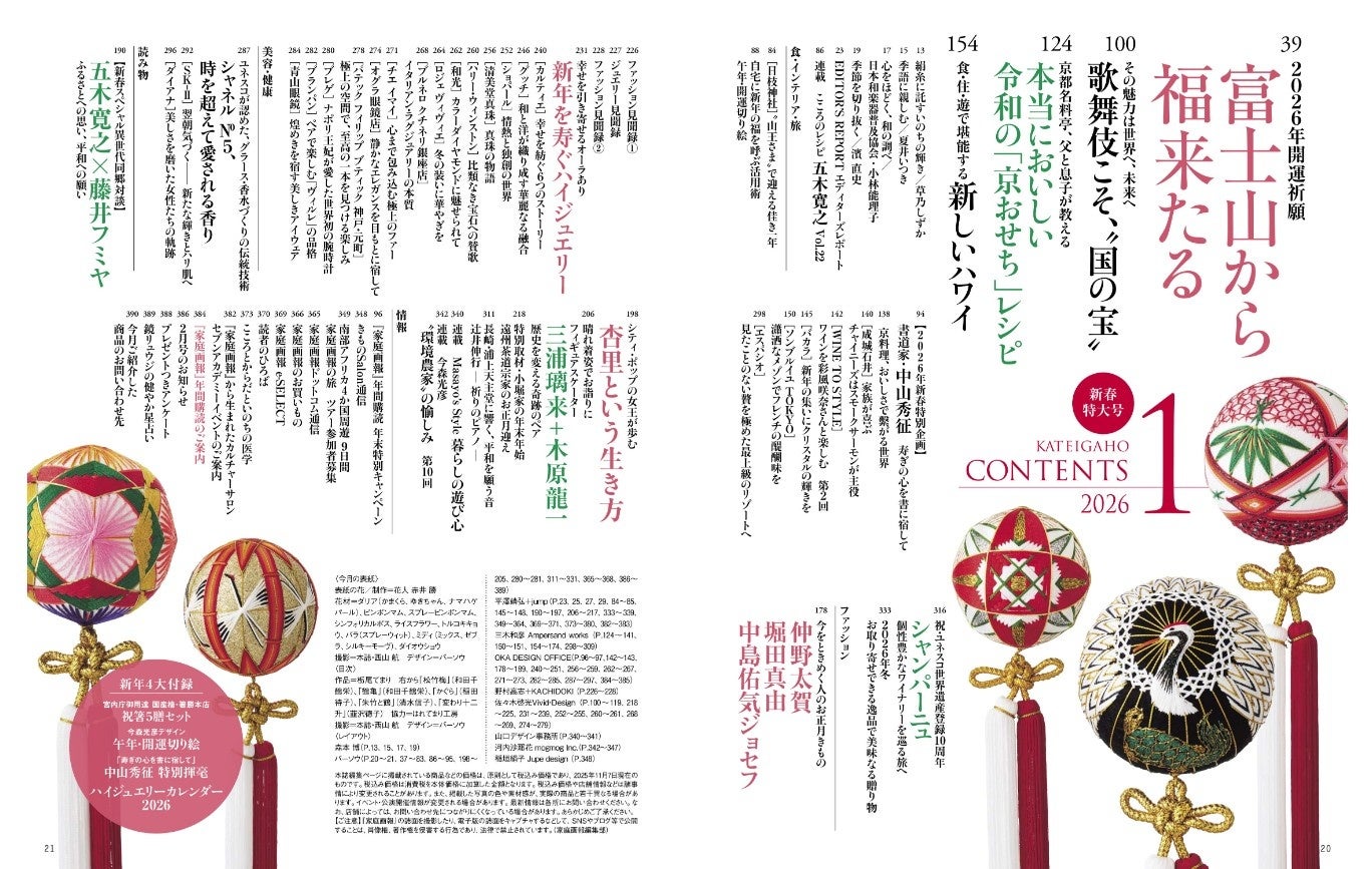 株式会社世界文化社は、『家庭画報2026年1月号』を12月1日(月)に発売しました。巻頭特集「富士山から福来たる」では、旅先や自宅で霊峰富士の力に触れ開運を祈願します。「歌舞伎こそ”国の宝”」では、歌舞伎俳優・中村鴈治郎さんと映画監督・李 相日さんの対談が実現。さらに、「名料亭の”京おせち”レシピ」、「食・住・遊で堪能する 新しいハワイ」、仲野太賀さん・堀田真由さん・中島佑気ジョセフさんがまとう正月きもの、フィギュアスケーター 三浦璃来さん・木原龍一さんのお詣り、杏里さんのロングインタビュー、五木寛之さん・藤井フミヤさんの新春特別対談など、新しい年の幕開けにふさわしい晴れやかな内容でお届けします。