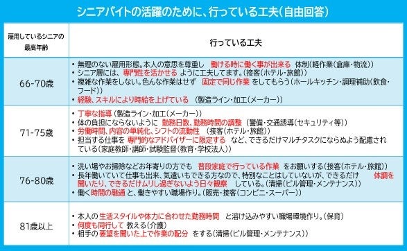 シニアバイトが活躍するための工夫を自由回答で見ると、「体の負担にならないように、勤務日数、勤務時間の調整」や「できるだけ体調を聞くなど、無理をしないように見ている」「相手の要望を聞いたうえで、業務を分配している」といった回答がみられ、企業側が勤務形態に柔軟性を持たせることや、業務内容の負担を軽減する工夫を行うなど、これまでの経験やスキルを発揮しつつ無理なく働き続けられる環境づくりを進めていることがうかがえた。【図3、4】