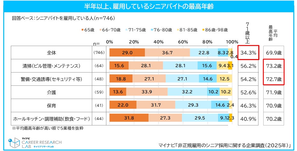 ◆71歳以上のシニアバイトを半年以上雇用している企業は34.3%。業種別の最高年齢の平均では、[清掃(ビル管理・メンテナンス)]が73.2歳で最も高い