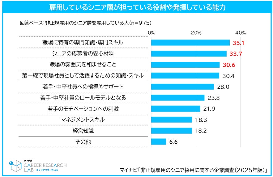 非正規雇用のシニアに対する今後の採用意向では、「採用したい(「積極的に採用したい(18.9%)」+「どちらかといえば採用したい(38.2%)」)」が57.1%で半数を超えた。採用したい理由は、「人手不足の解消・改善に繋がるから(48.9%)」が最も高く、「専門性が高い・経験が豊富(34.4%)」、「採用基準に年齢は関係ないから(24.5%)」が続いた。また、勤務先でシニアが担っている役割や発揮している能力では、「職場に特有の専門知識・専門スキル(35.1%)」が最も多く、次いで「シニアの応募者の安心材料(33.7%)」、「職場の雰囲気を和ませること(30.6%)」となった。企業はシニアに対して、経験や人柄、在籍していることそのものが職場に価値をもたらす存在として認識されていることがうかがえる。【図5、6、7】