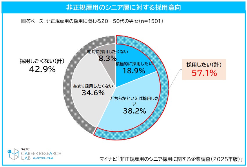 こうした中、今回の調査では、企業の57.1%が非正規雇用のシニア(65歳以上)を「採用したい」と回答しており、企業側の採用意欲も高いことが分かりました。