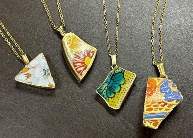 割れてしまった九谷焼の破片を使用し、金継ぎやレジンなどで加工してアクセサリーに!陶片の形や、金継ぎなど、ひとつひとつ違うデザインが楽しめます。イヤリングやピアスをはじめ、ネックレスや帯留、ブローチなども!お手軽に工芸品を楽しむことができます。