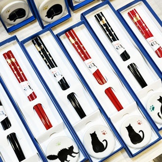 輪島のお箸と九谷焼の箸置のセットをご用意!猫のシルエットを描いたものの他、平和の象徴折鶴のデザインも。石川県の工芸品を楽しむことのできるセットです。
