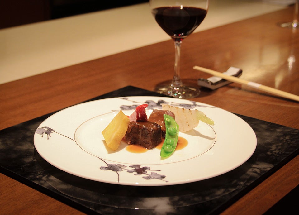 その選び抜かれたワインにシェフ 長澤 敦史が手掛ける、季節の食材を和のテイストで美しく、繊細に仕上げた特別ディナーコースをご用意しました。メイン料理の『牛頬肉の和風柔らか煮 京都産野菜とともに』は、牛頬肉をじっくりと時間をかけ、箸でほぐれそうなほど柔らかく煮込み、彩り豊かな京都産野菜を添え、和の趣を感じる一皿に仕上げました。塩尻メルロの深みある味わいが、牛頬肉の旨味と絶妙に調和し、口の中で豊かな余韻を奏でます。カウンター越しに魅せるシェフの洗練された手さばきがワインの香りや味わいをより一層引き立てます。