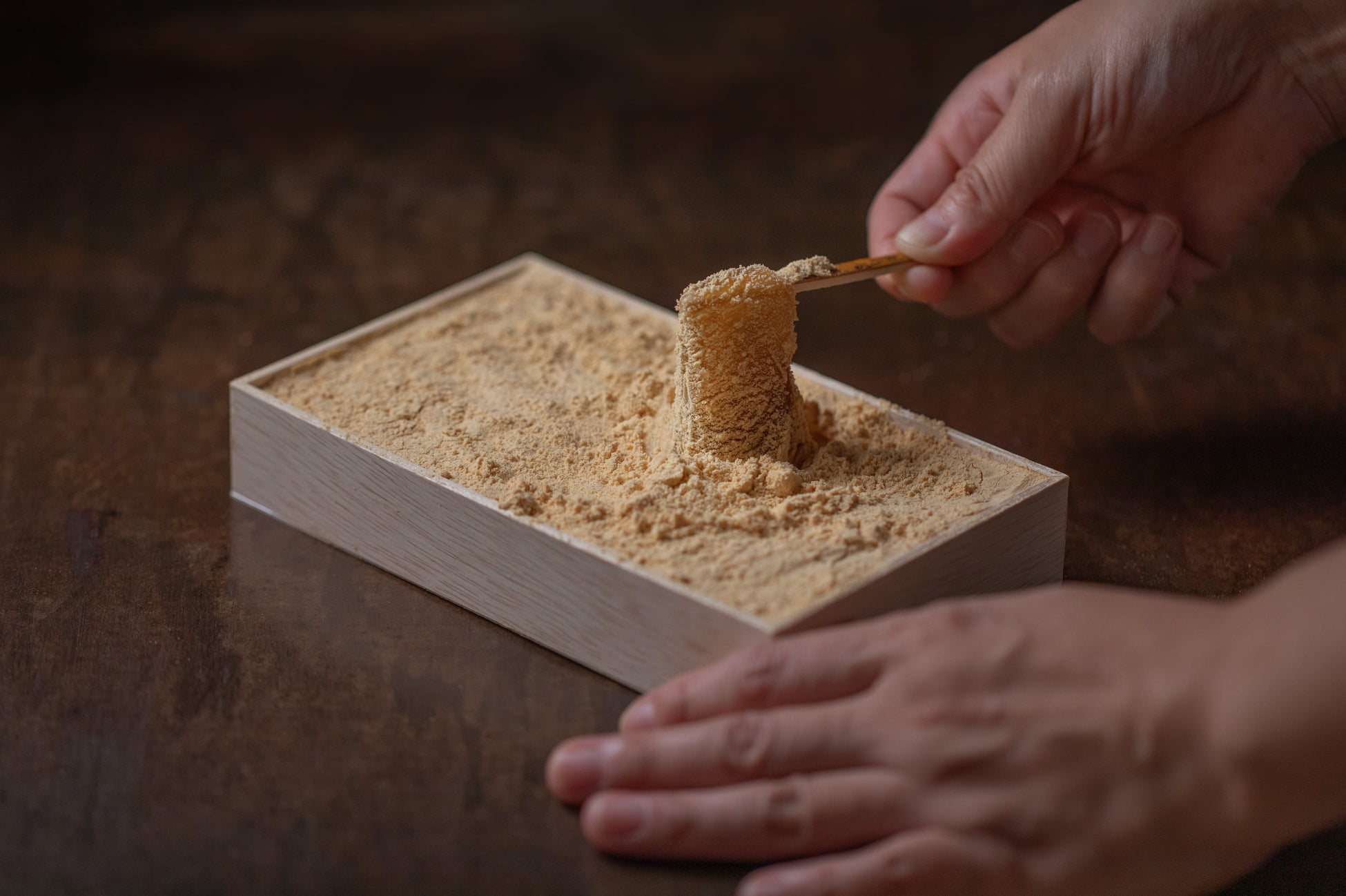 みずみずしさを閉じ込めるように丸く手切りした、とろけるようなふわふわ食感のわらび餅。箱いっぱいに敷き詰めたきめ細やかなきな粉は、このわらび餅のために特別に焙煎しており、黒糖のほのかな余韻、北海道産大豆の香りと甘みを引き出したきな粉との調和をお楽しみください。