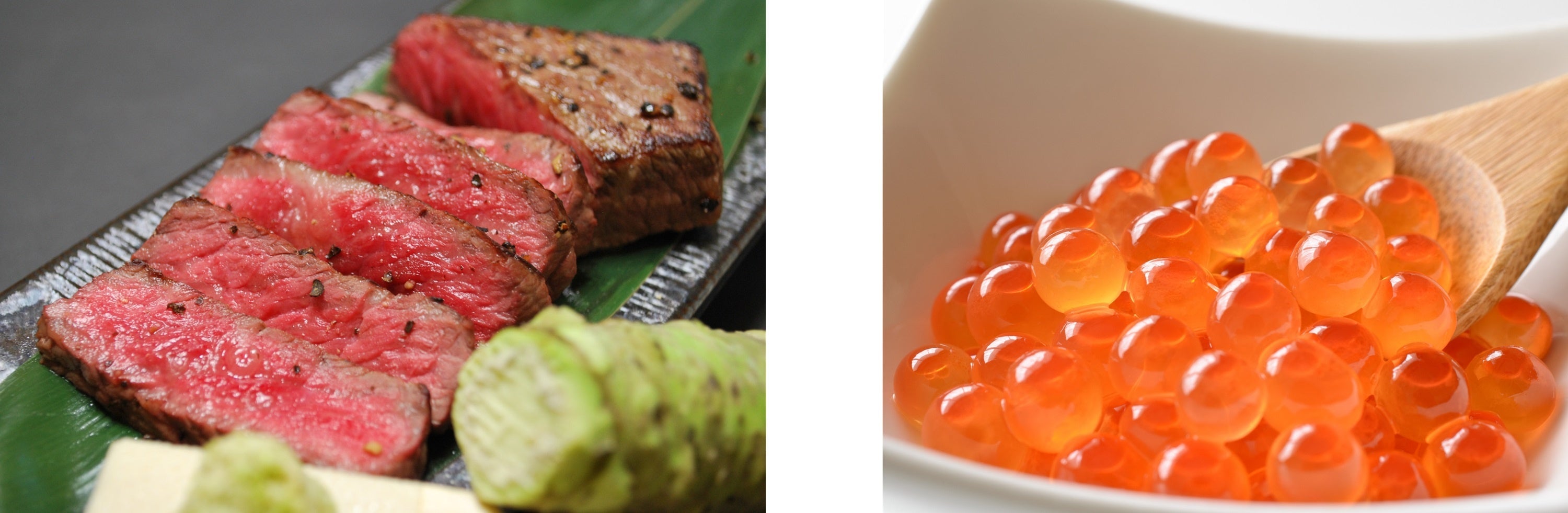 <熊本県南小国町 阿蘇高原牛肩ロースステーキ> <北海道白糠町 いくら醤油漬>