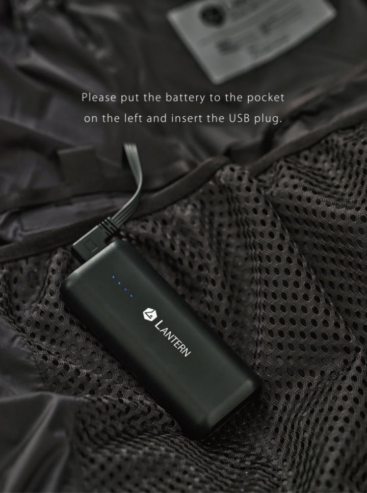 左袖や胸元の竜源温度調整スイッチで温度調整ができる中綿ウェアです。ヒーティングデバイスは充電バッテリーを本製品のUSBプラグと繋げて作動するシステムで、スイッチは温度によって色が変化します。熱源であるヒートは炭素繊維から作られており、遠赤外線効果により体を芯から暖かくします。ヒーティングデバイスの動作時間は充電バッテリー容量や設定温度によって変動します。
